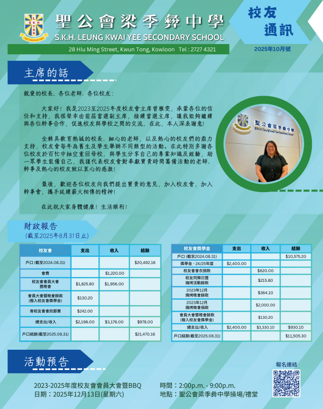 報名程序 | 1. 先入數/轉帳至聖公會梁季彜中學戶口 The IMC of S.K.H. Leung Kwai Yee Secondary School:匯豐銀行(848-682555-838)。 2. 再將成功入數/轉帳的銀行紀錄截圖或拍照。 3. 填妥2023/2025年度校友會會員大會暨燒烤晚會Google Form 報名表,並於Google Form上上載入數/轉帳紀錄。 4. 成功報名後,將收到電郵再次確認。 | |
